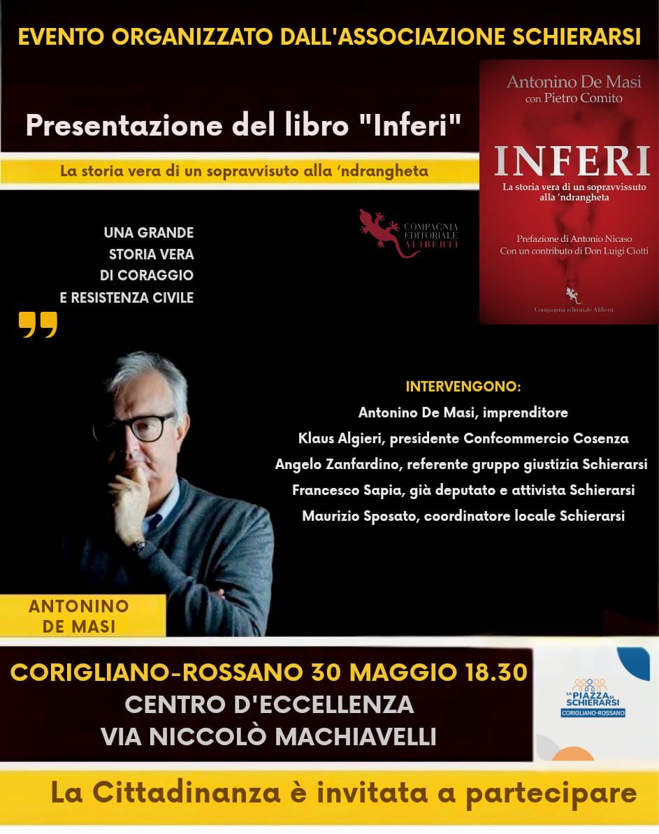 Il gruppo locale di Corigliano Rossano ha organizzato la presentazione del libro “Inferi – la storia vera di un sopravvissuto alla ‘Ndrangheta ” di Antonino De Masi.