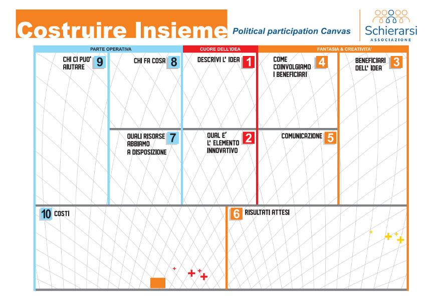 La tela, ovvero il Canvas, è stata suddivisa in aree tematiche, distinte in tre colori: Rosso |Cuore dell’Idea, Arancione | Fantasia & Creatività, Azzurro | Parte operativa,e dieci caselle, ognuna delle quali rappresenta un aspetto specifico del progetto che deve essere analizzato dal gruppo di lavoro.